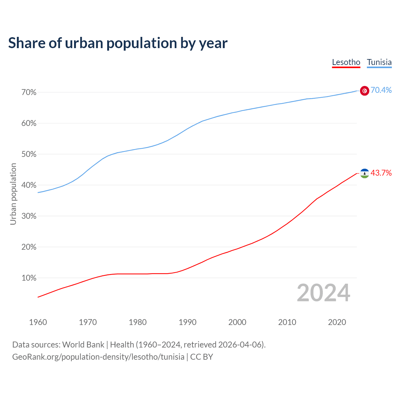 From 2004 to 2024, the share of urban population changed from 21.8% to 43.7% in Lesotho and from 64.9% to 70.4% in Tunisia.