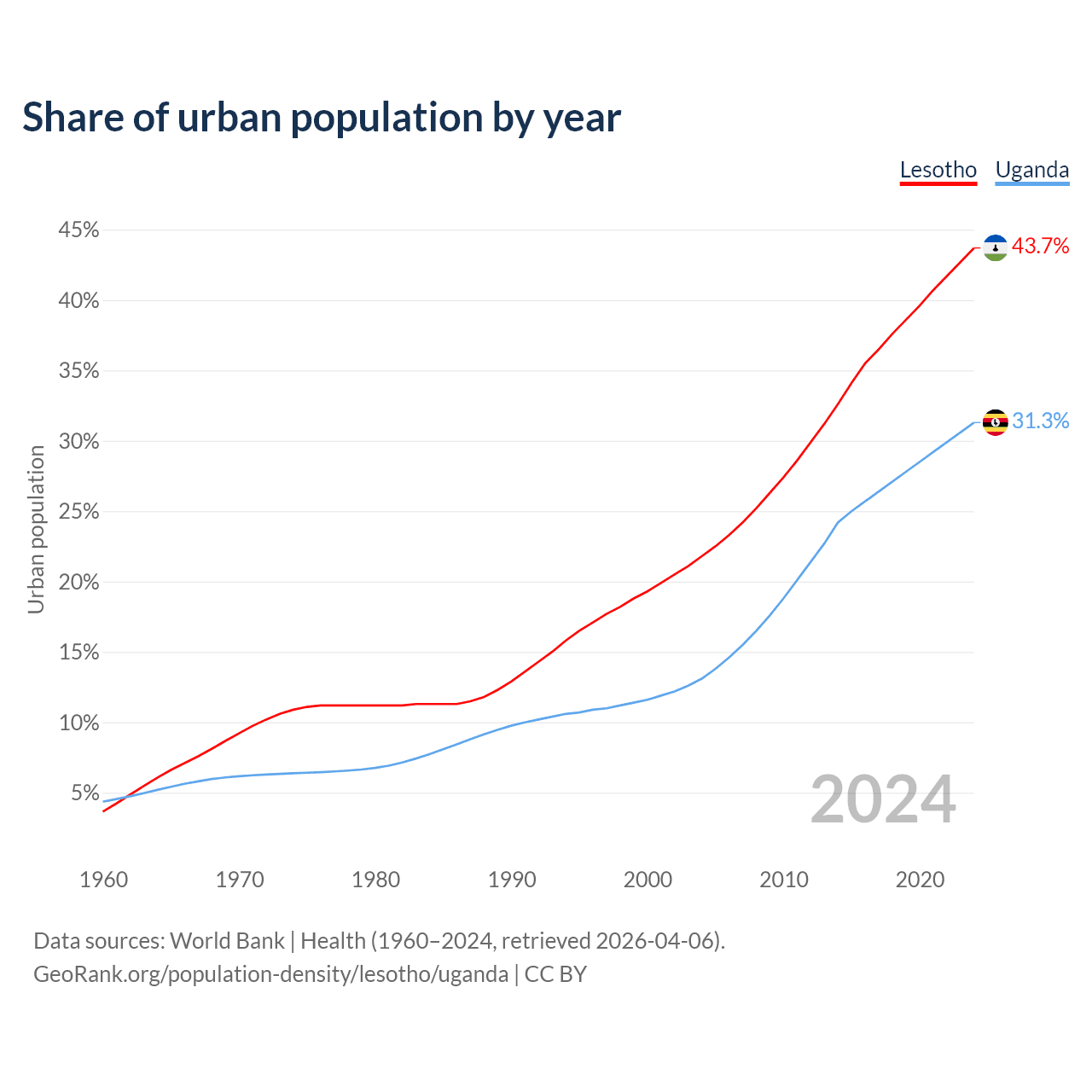 From 2004 to 2024, the share of urban population changed from 21.8% to 43.7% in Lesotho and from 13.1% to 31.3% in Uganda.