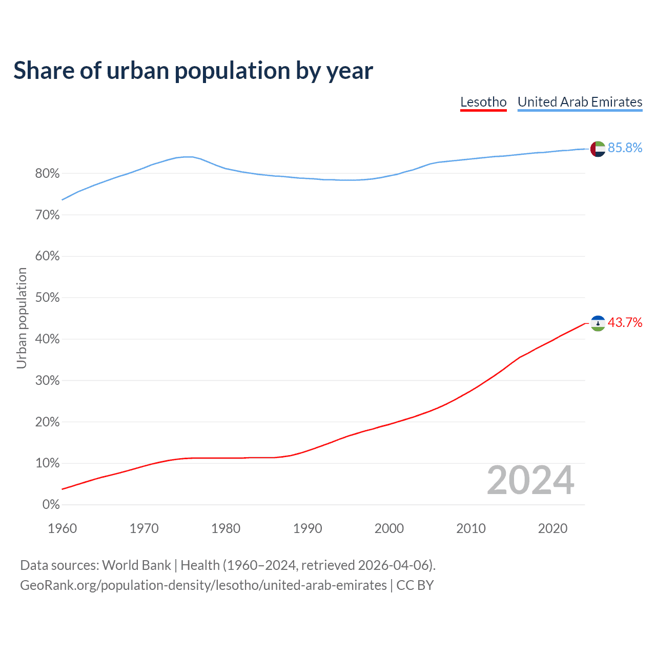From 2004 to 2024, the share of urban population changed from 21.8% to 43.7% in Lesotho and from 81.5% to 85.8% in the United Arab Emirates.