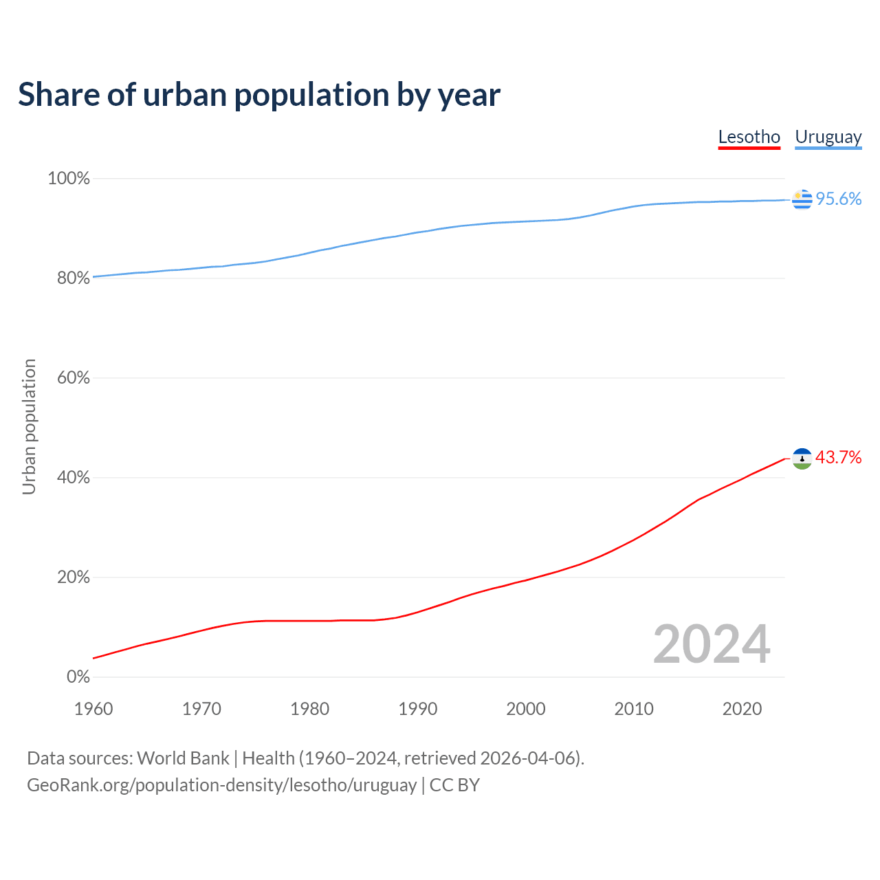From 2004 to 2024, the share of urban population changed from 21.8% to 43.7% in Lesotho and from 91.8% to 95.6% in Uruguay.