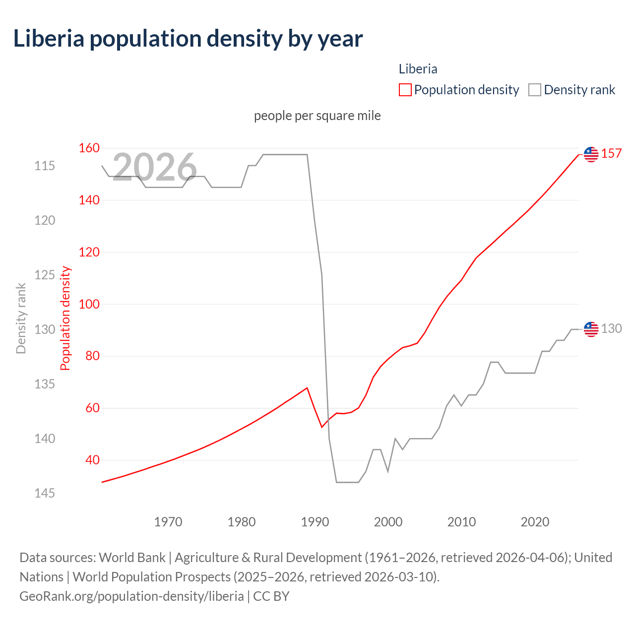 This chart shows how population density in Liberia has changed over time. From 2006 to 2026, population density increased by 67.6%. Liberia ranked 140th by population density 20 years ago and ranks 130th today.