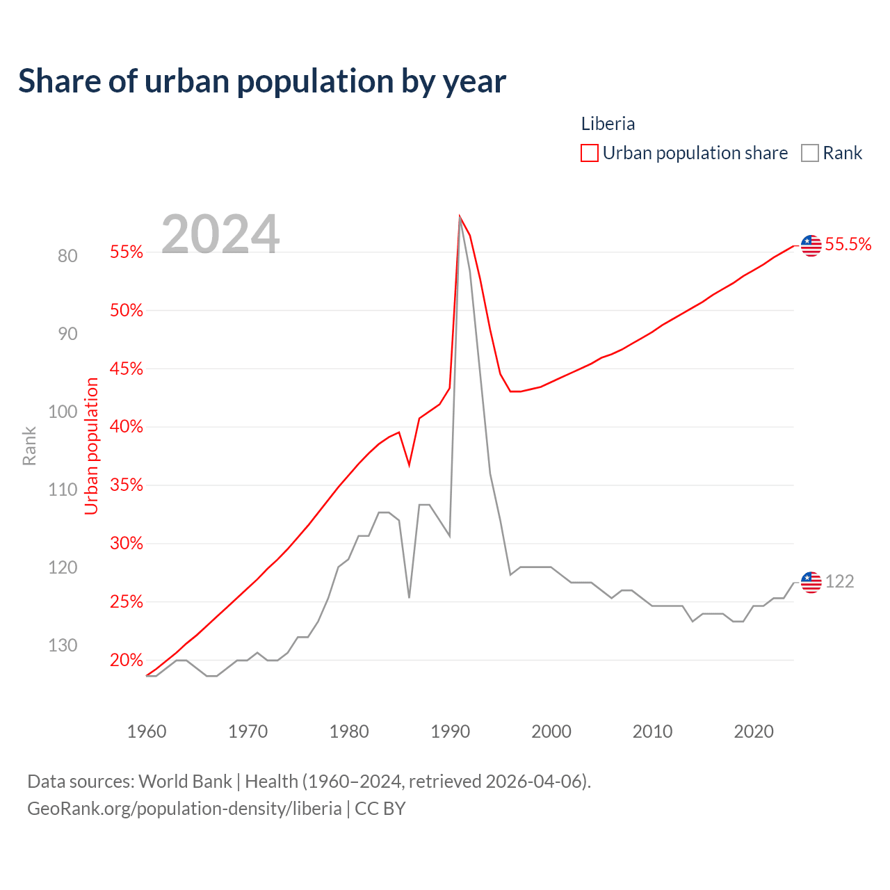 This chart shows the share of urban population in Liberia from 1960 to 2024: 18.6% lived in urban areas in 1960, 43.8% in 2000, and 55.5% in 2024.