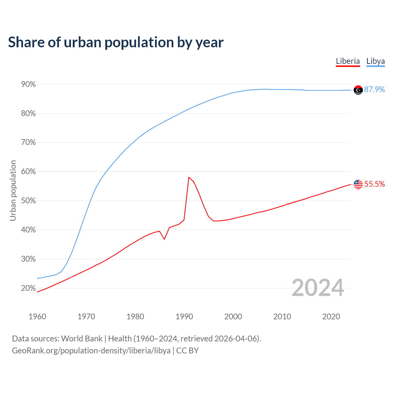 From 2004 to 2024, the share of urban population changed from 45.4% to 55.5% in Liberia and from 88% to 87.9% in Libya.