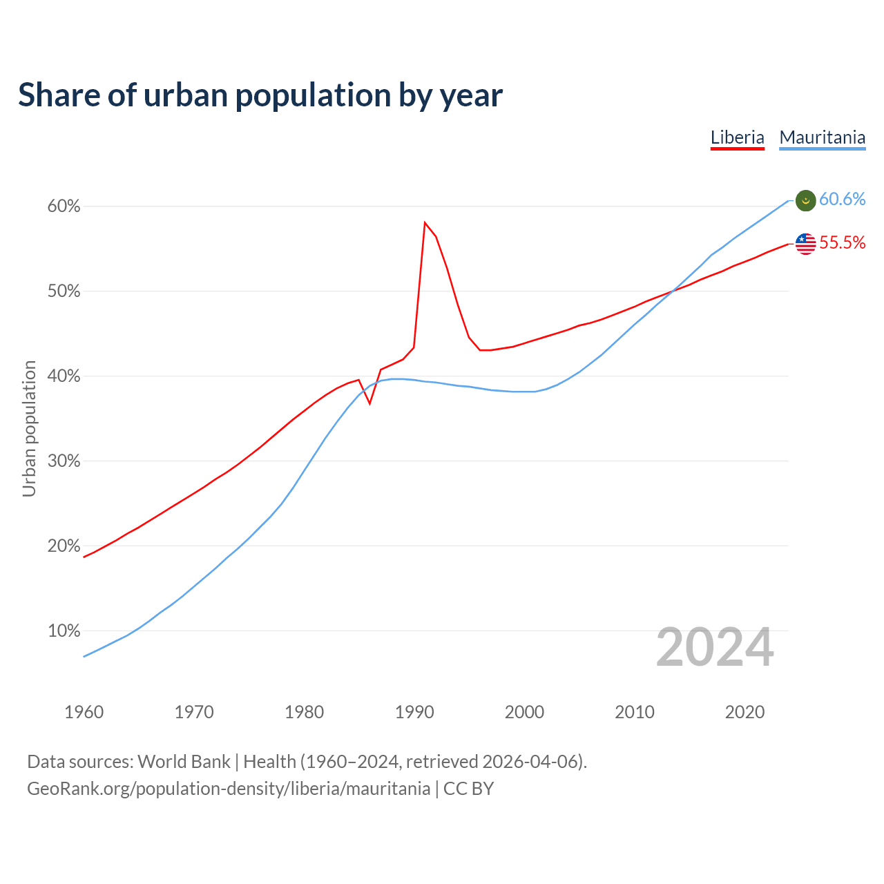 From 2004 to 2024, the share of urban population changed from 45.4% to 55.5% in Liberia and from 39.6% to 60.6% in Mauritania.