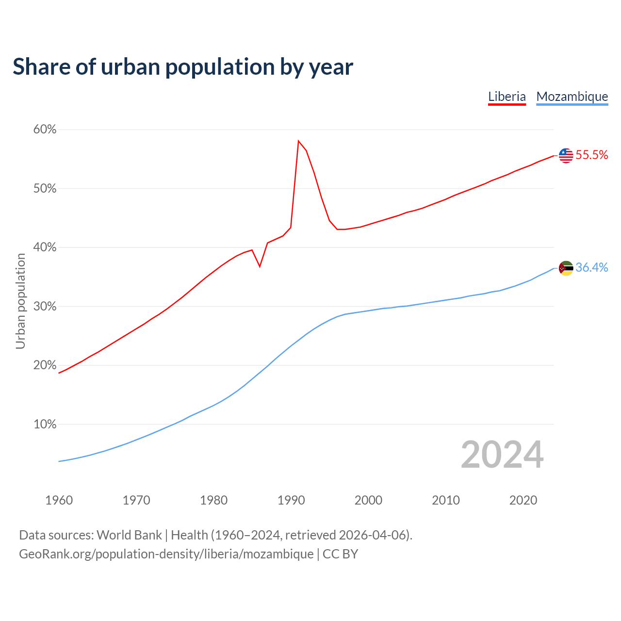 From 2004 to 2024, the share of urban population changed from 45.4% to 55.5% in Liberia and from 29.9% to 36.4% in Mozambique.