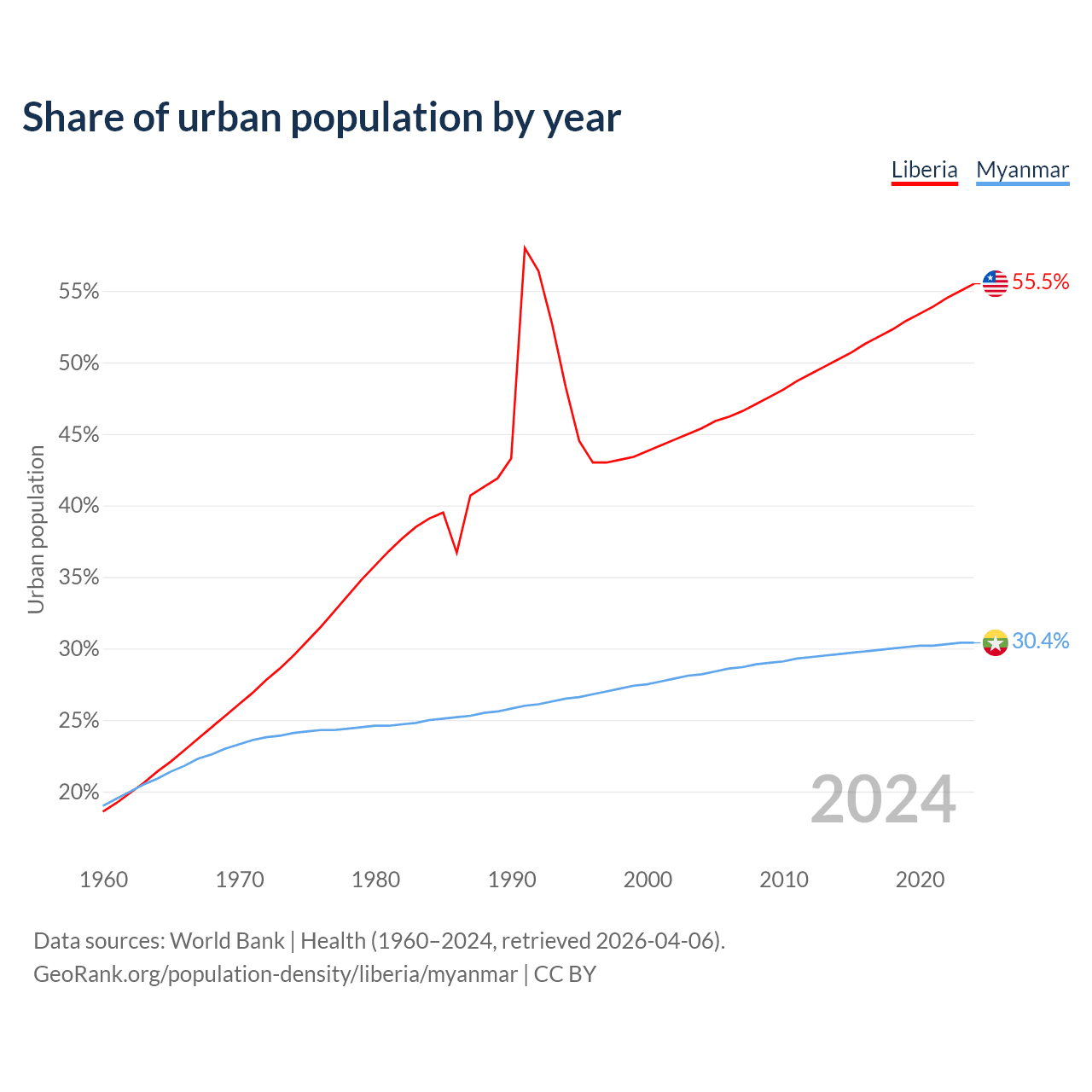 From 2006 to 2026, population density in Liberia increased by 67.6%, compared to a 15.7% growth in Myanmar.