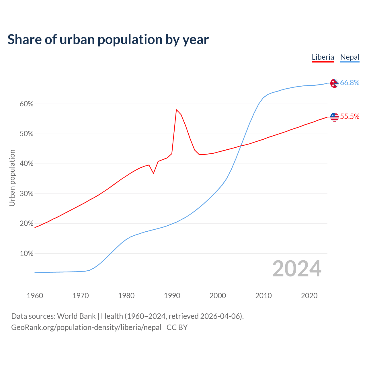 From 2006 to 2026, population density in Liberia increased by 67.6%, compared to a 11.4% growth in Nepal.