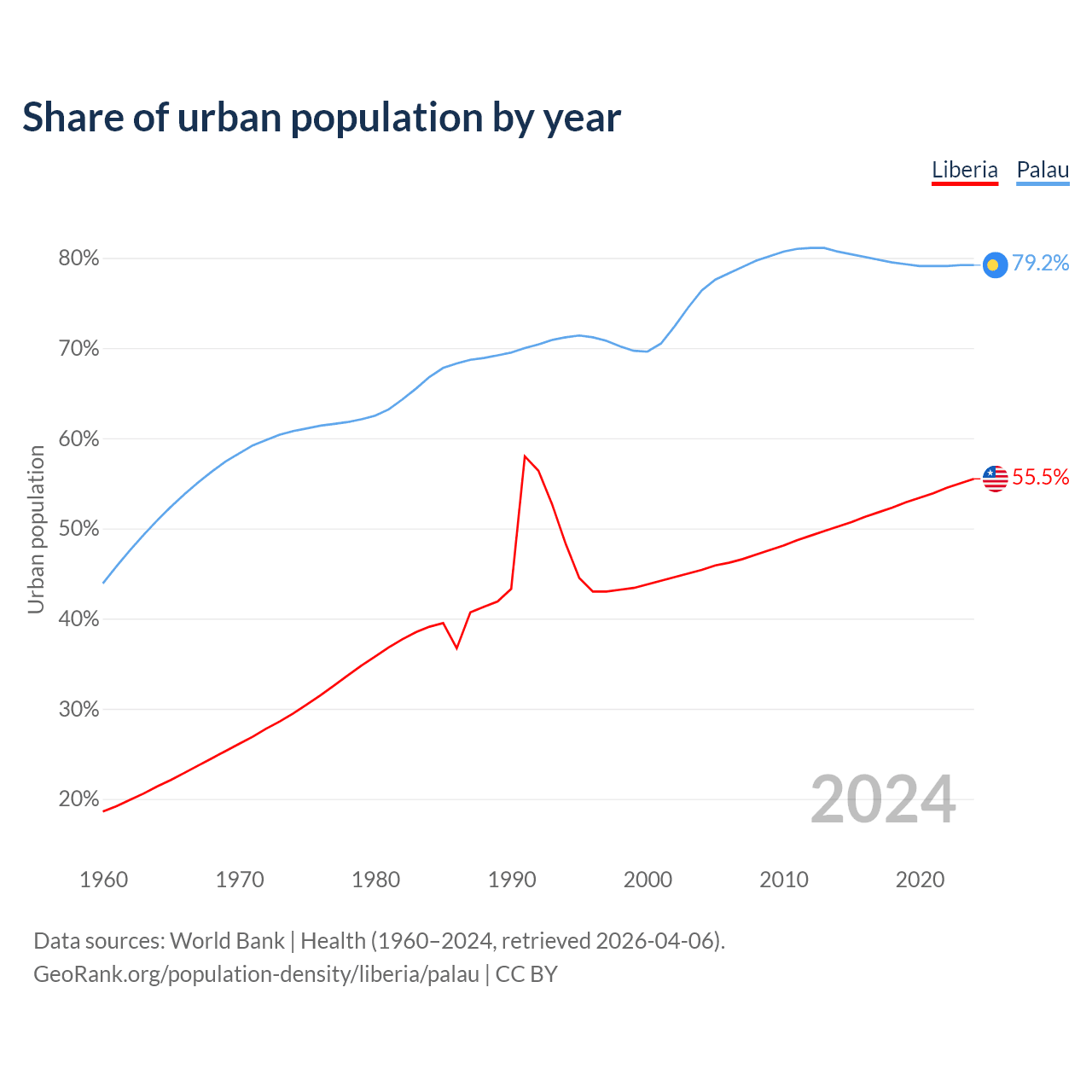 From 2004 to 2024, the share of urban population changed from 45.4% to 55.5% in Liberia and from 76.4% to 79.2% in Palau.