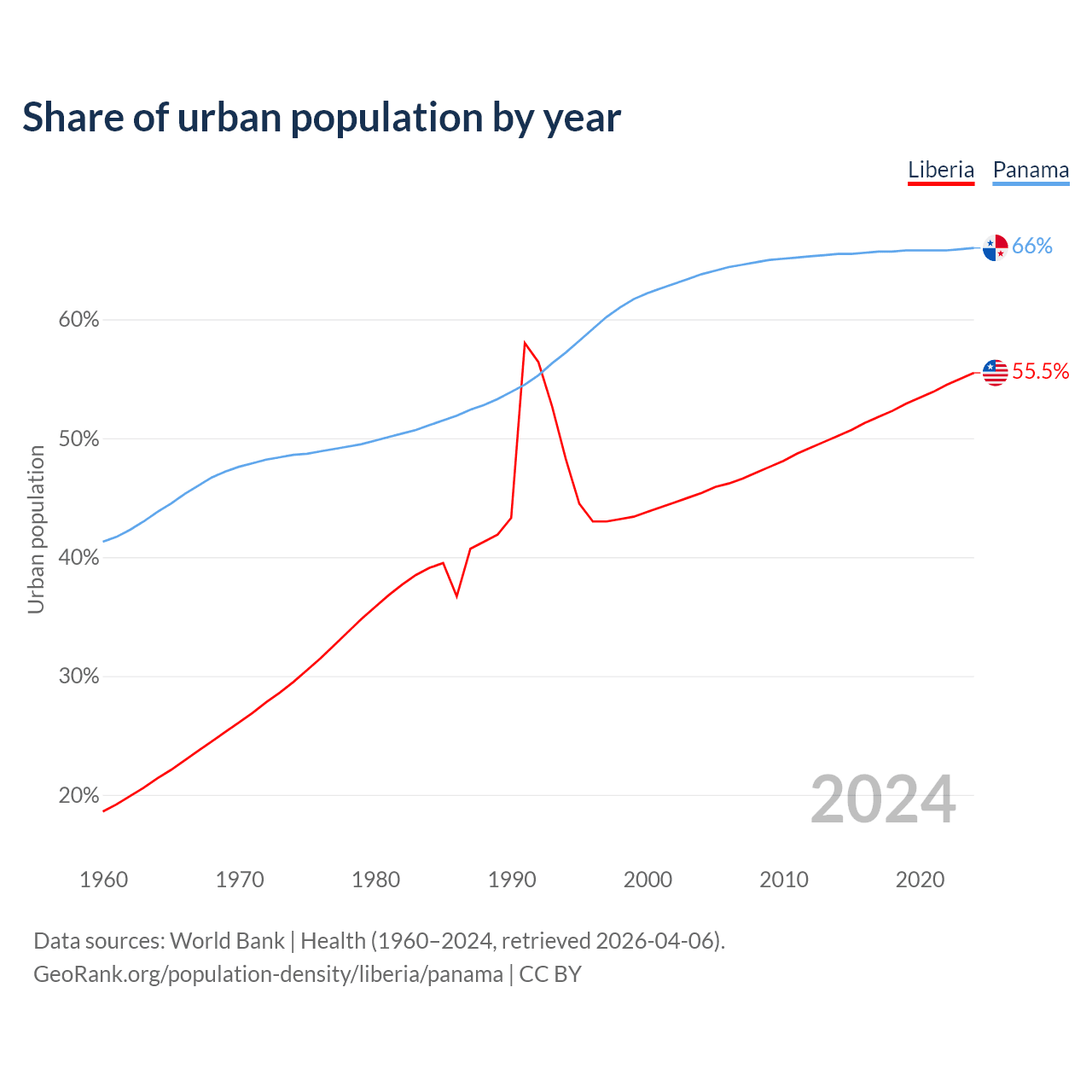 From 2004 to 2024, the share of urban population changed from 45.4% to 55.5% in Liberia and from 63.8% to 66% in Panama.