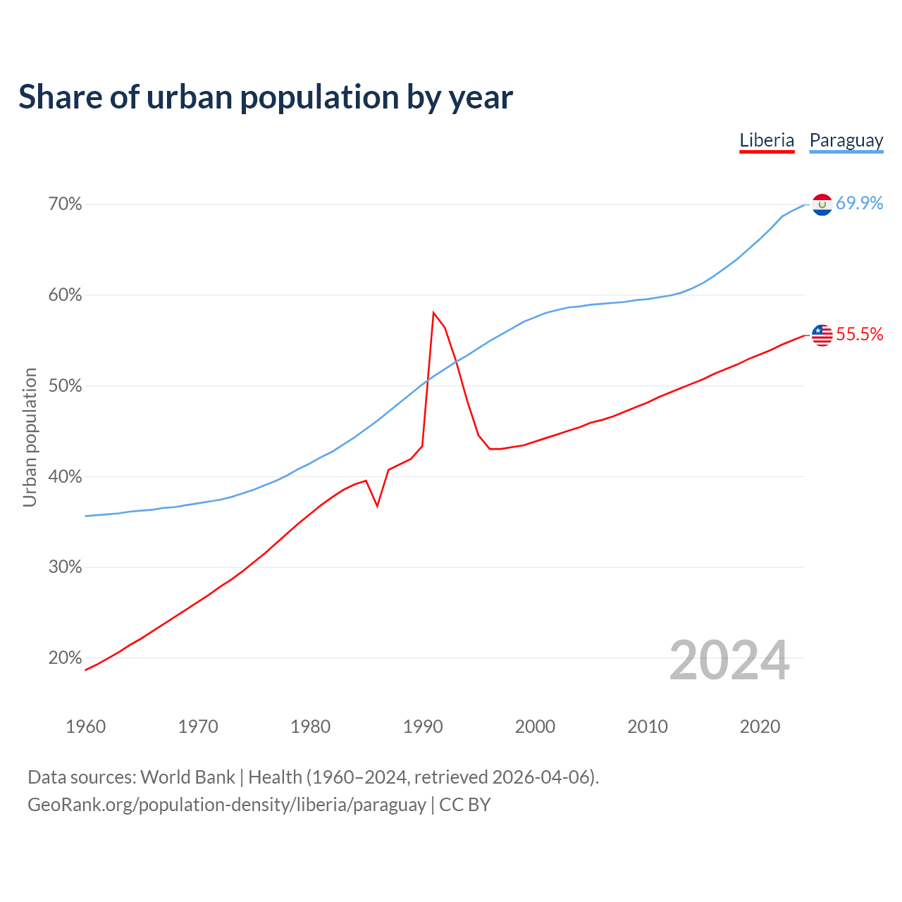 From 2004 to 2024, the share of urban population changed from 45.4% to 55.5% in Liberia and from 58.7% to 69.9% in Paraguay.