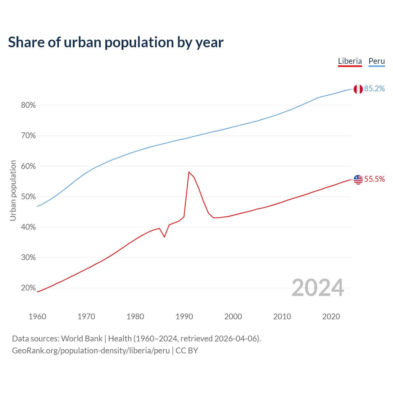 From 2004 to 2024, the share of urban population changed from 45.4% to 55.5% in Liberia and from 74.4% to 85.2% in Peru.