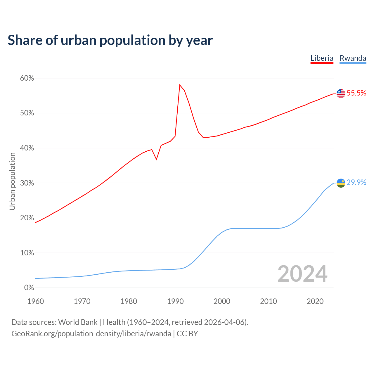 From 2006 to 2026, population density in Liberia increased by 67.6%, compared to a 60.1% growth in Rwanda.
