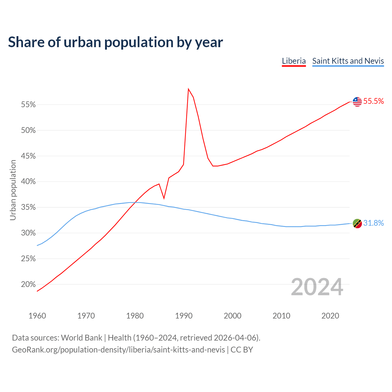 From 2004 to 2024, the share of urban population changed from 45.4% to 55.5% in Liberia and from 32.1% to 31.8% in Saint Kitts and Nevis.