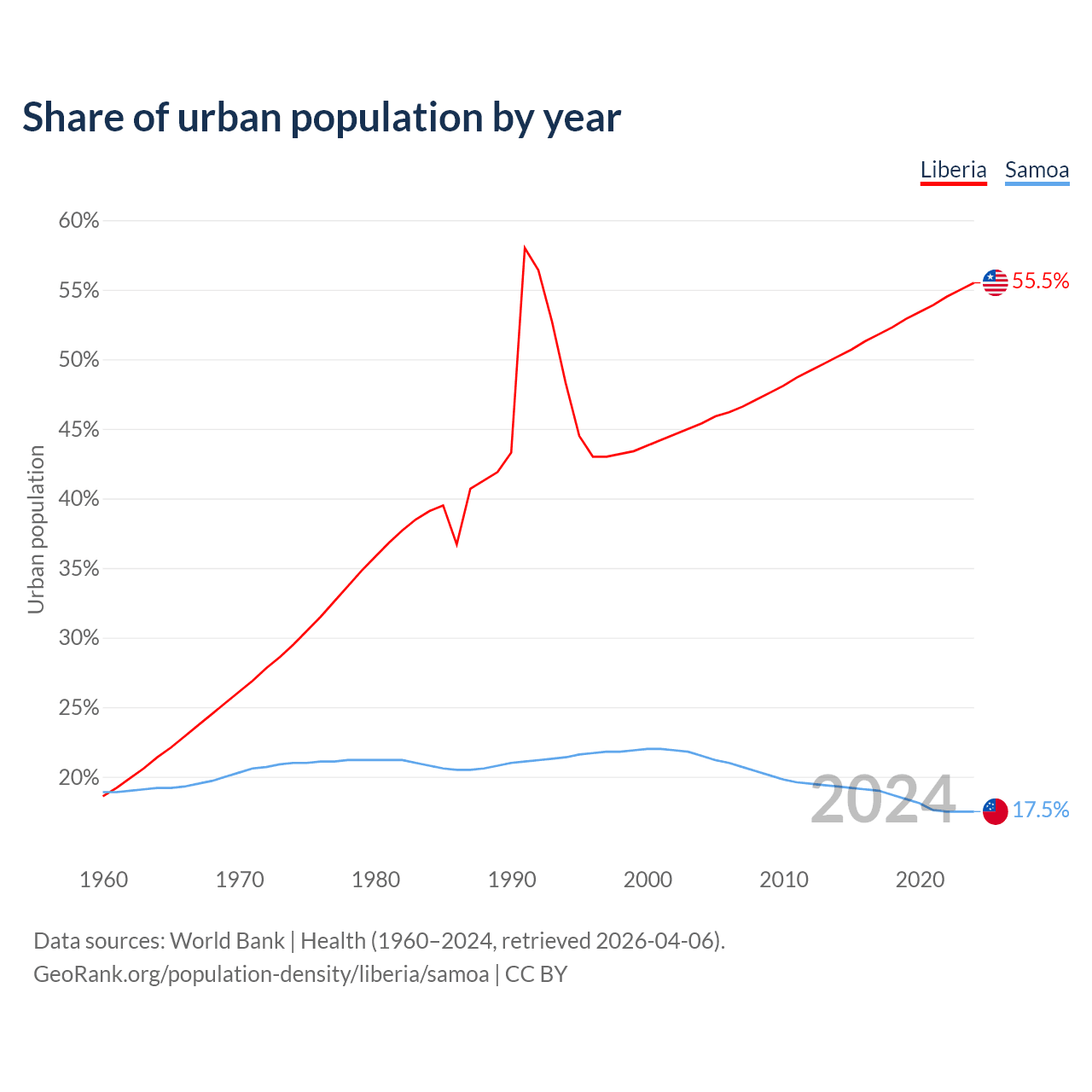 From 2004 to 2024, the share of urban population changed from 45.4% to 55.5% in Liberia and from 21.5% to 17.5% in Samoa.