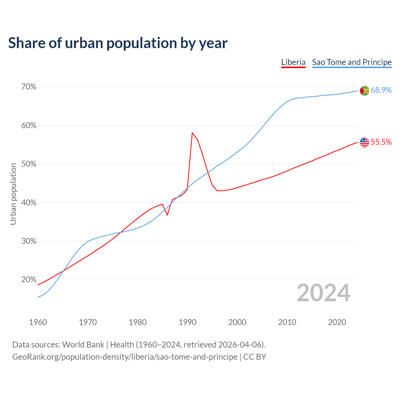 From 2006 to 2026, population density in Liberia increased by 67.6%, compared to a 48% growth in Sao Tome and Principe.
