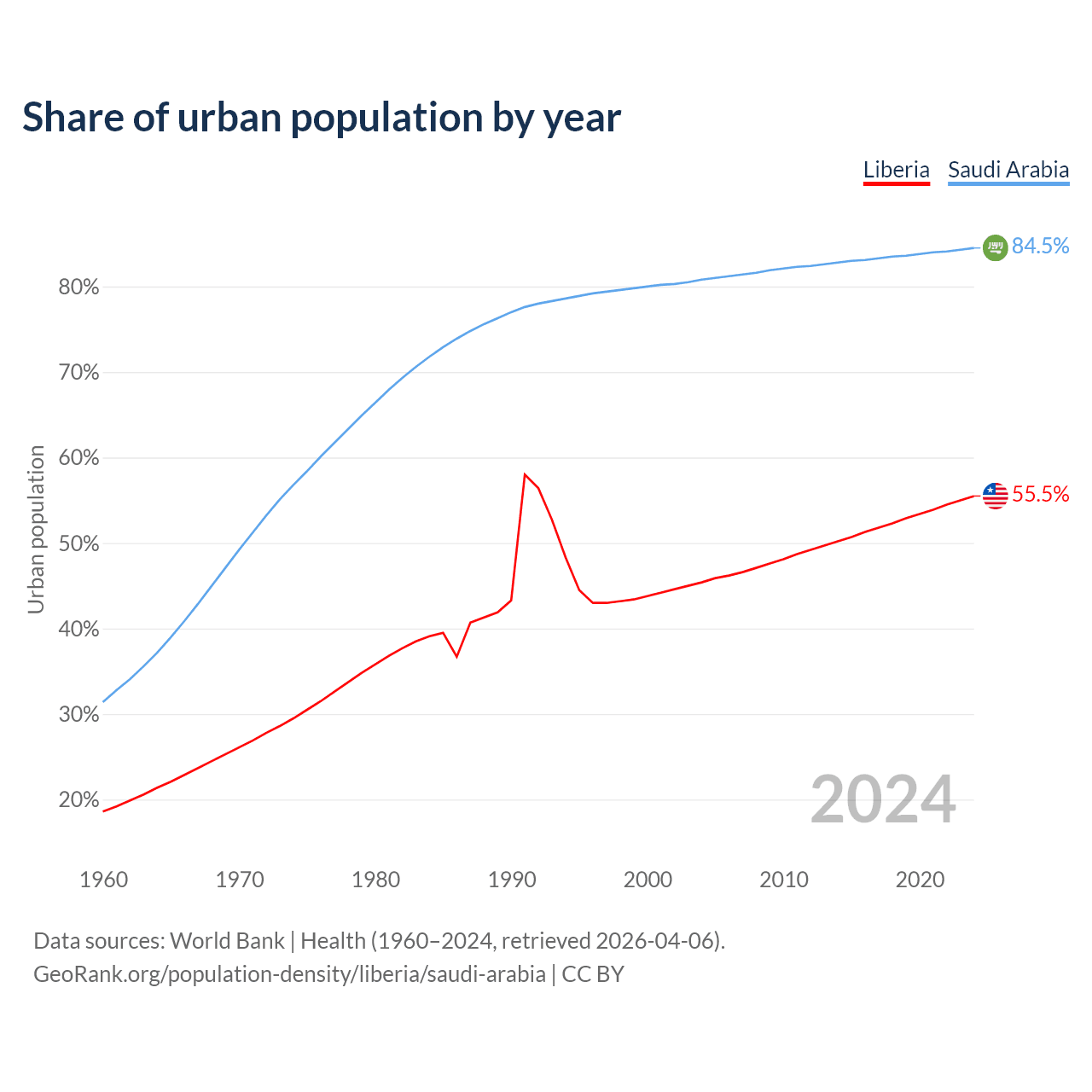 From 2006 to 2026, population density in Liberia increased by 67.6%, compared to a 70.4% growth in Saudi Arabia.