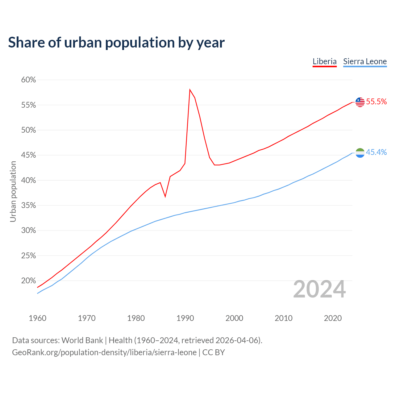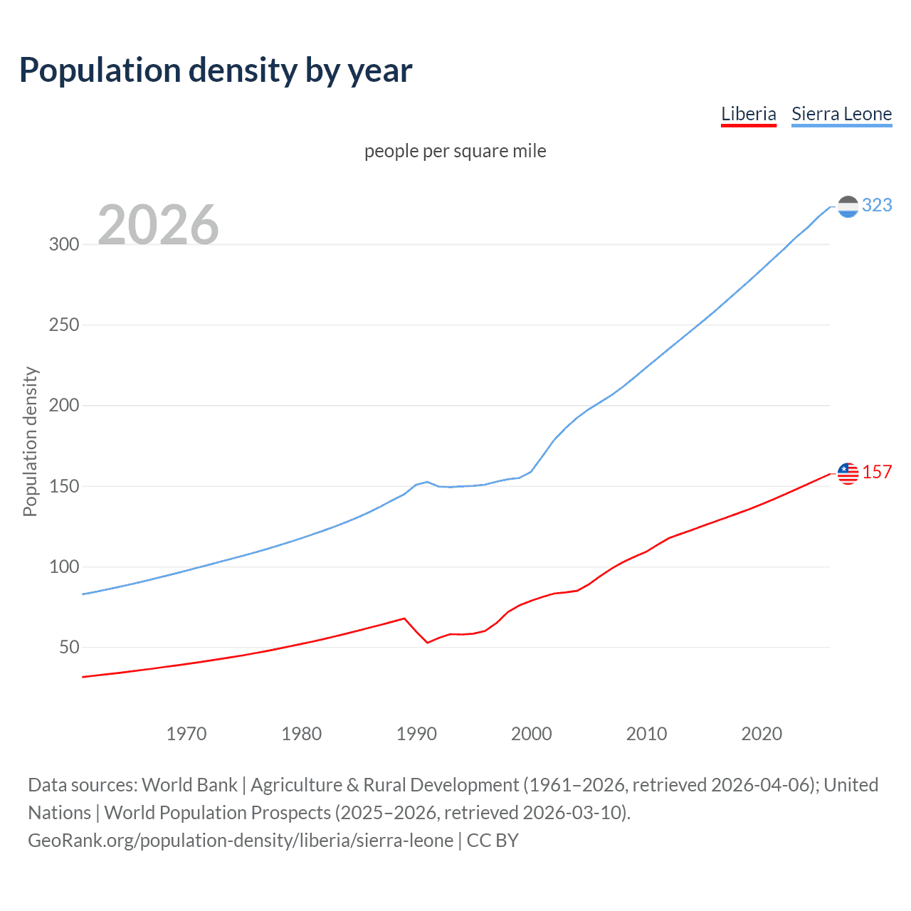 From 2006 to 2026, population density in Liberia increased by 67.6%, compared to a 60% growth in Sierra Leone.