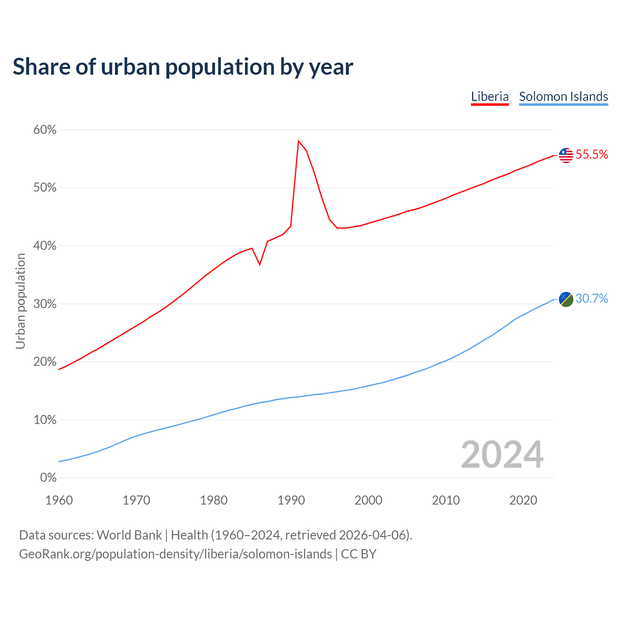 From 2004 to 2024, the share of urban population changed from 45.4% to 55.5% in Liberia and from 17.2% to 30.7% in the Solomon Islands.