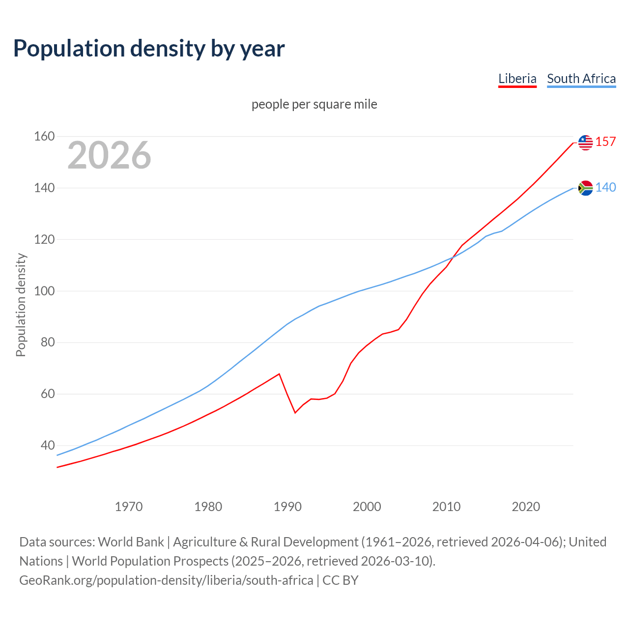 From 2006 to 2026, population density in Liberia increased by 67.6%, compared to a 31% growth in South Africa.