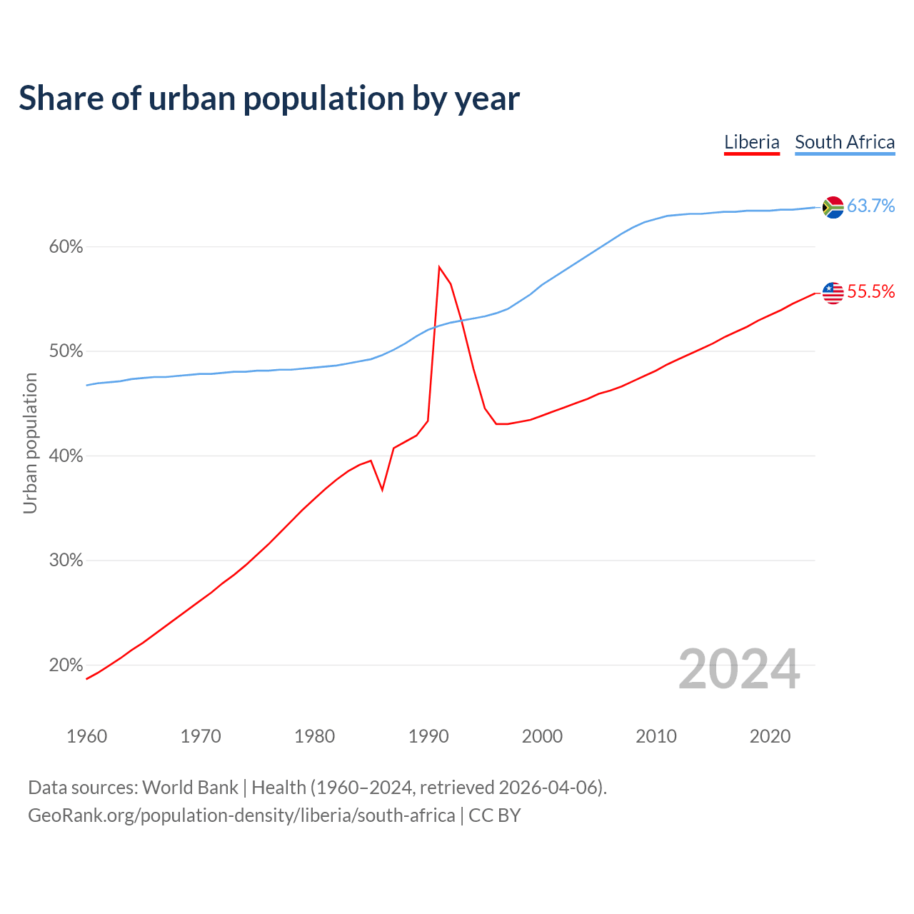 From 2004 to 2024, the share of urban population changed from 45.4% to 55.5% in Liberia and from 59.1% to 63.7% in South Africa.