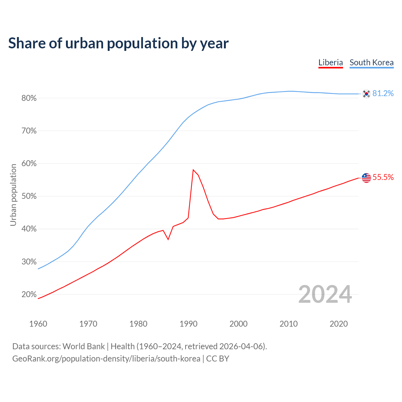 From 2006 to 2026, population density in Liberia increased by 67.6%, compared to a 5.84% growth in South Korea.