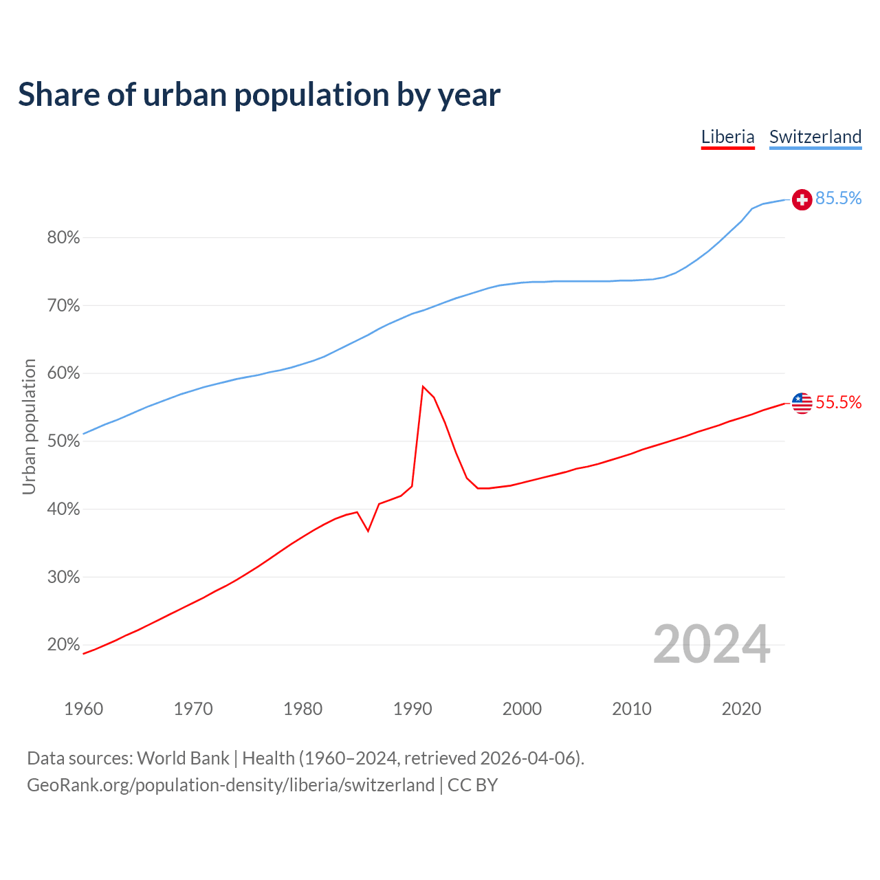 From 2006 to 2026, population density in Liberia increased by 67.6%, compared to a 21.6% growth in Switzerland.