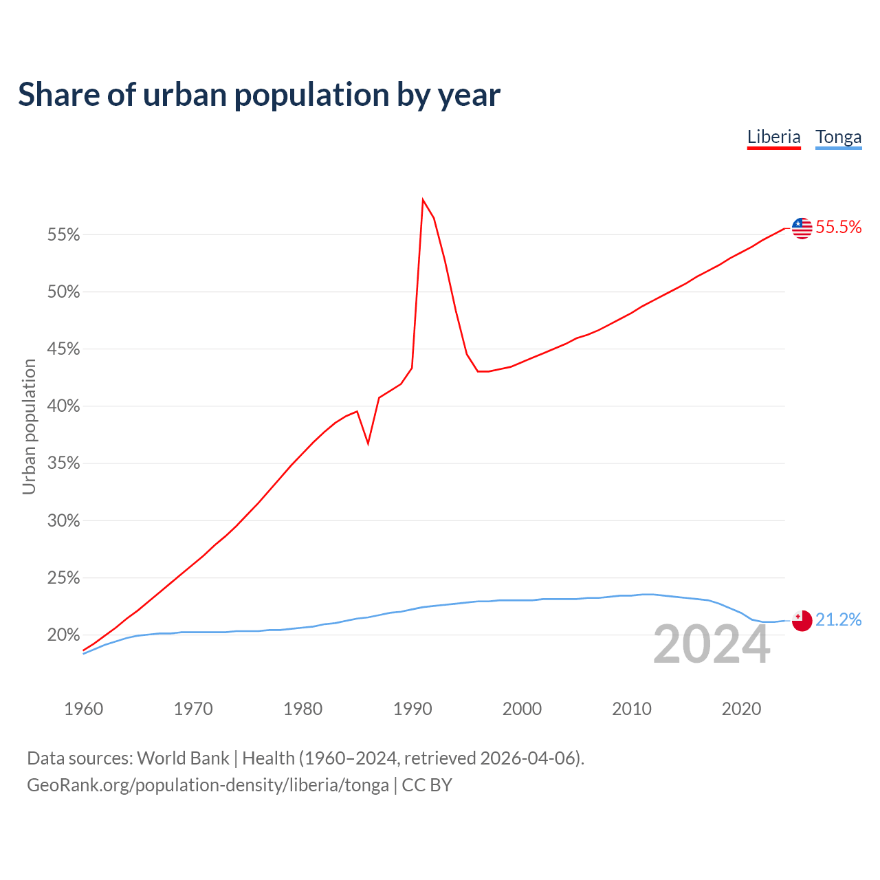 From 2004 to 2024, the share of urban population changed from 45.4% to 55.5% in Liberia and from 23.1% to 21.2% in Tonga.