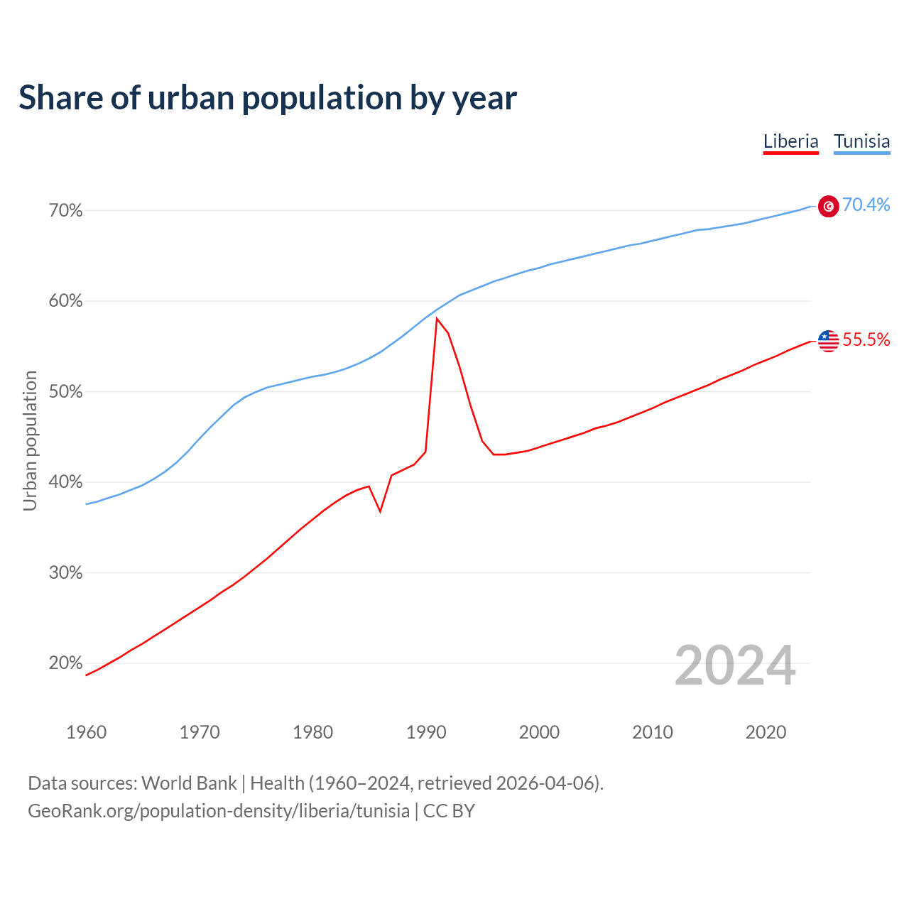 From 2004 to 2024, the share of urban population changed from 45.4% to 55.5% in Liberia and from 64.9% to 70.4% in Tunisia.