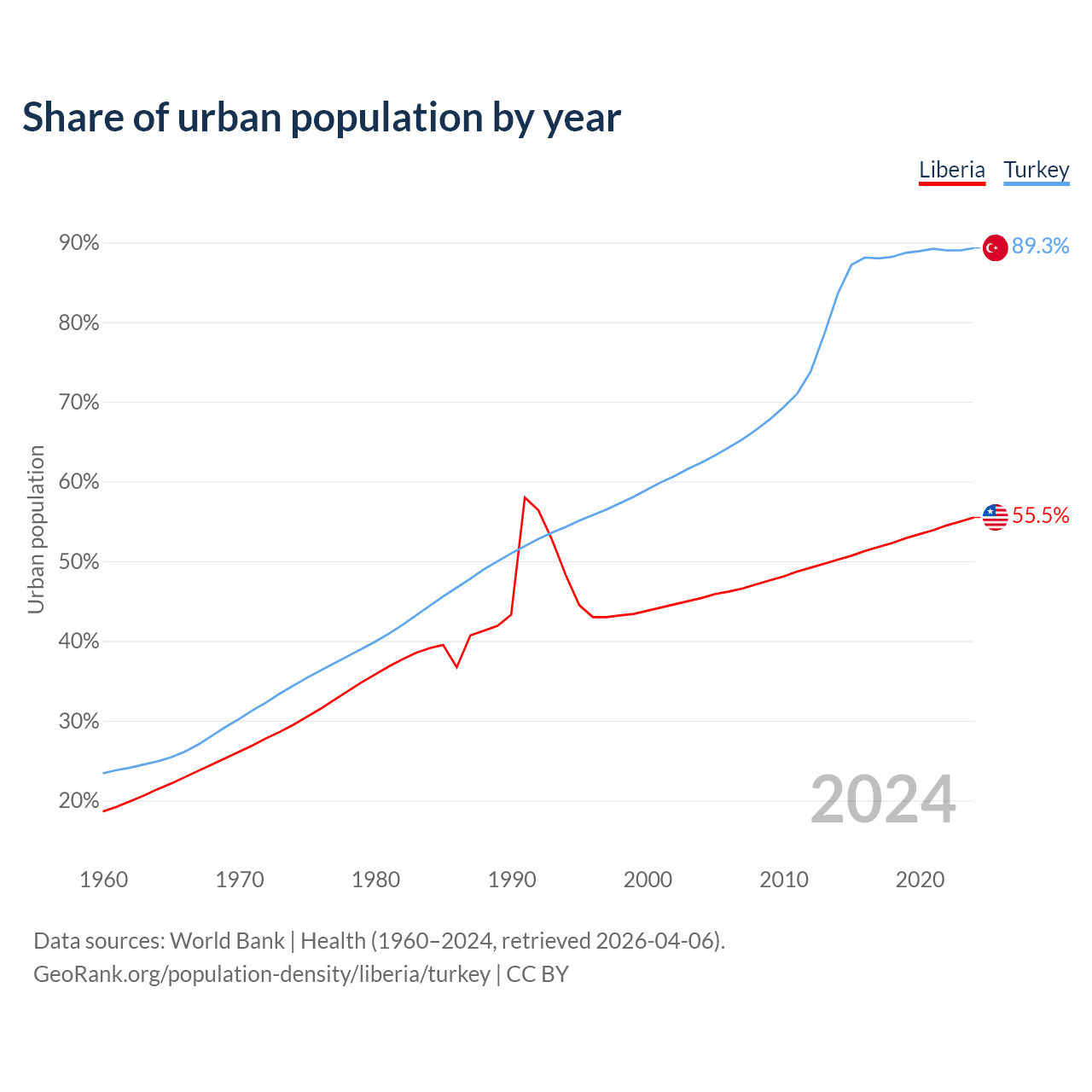 From 2004 to 2024, the share of urban population changed from 45.4% to 55.5% in Liberia and from 62.4% to 89.3% in Turkey.