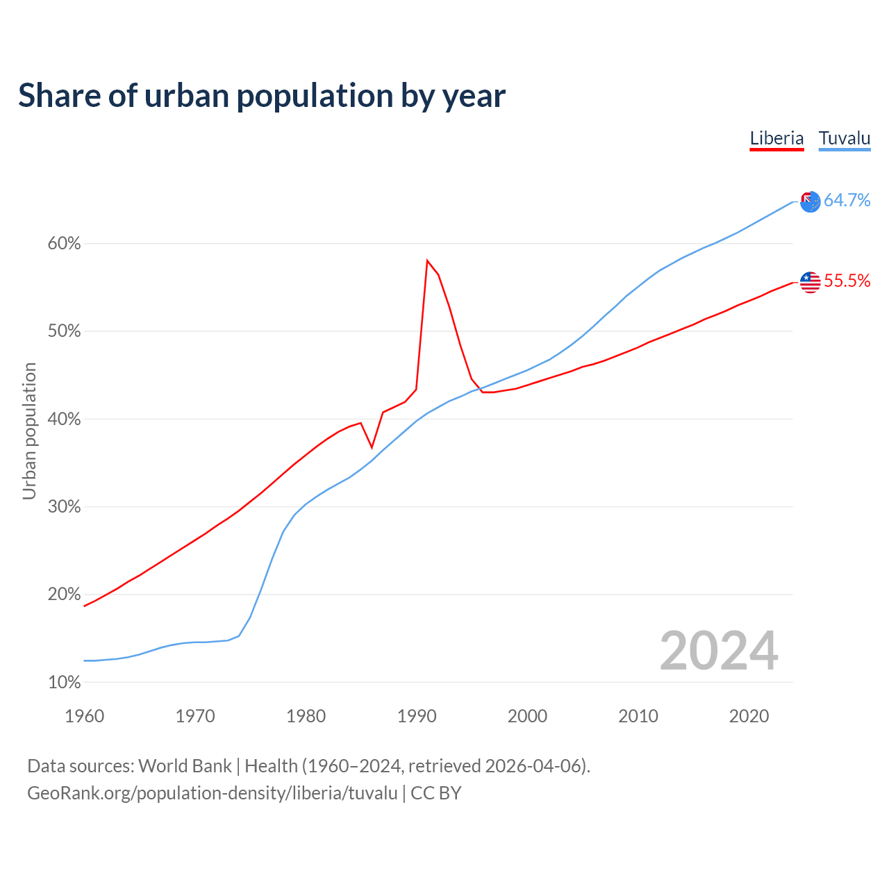 From 2006 to 2026, population density in Liberia increased by 67.6%, compared to a 7.1% decline in Tuvalu.