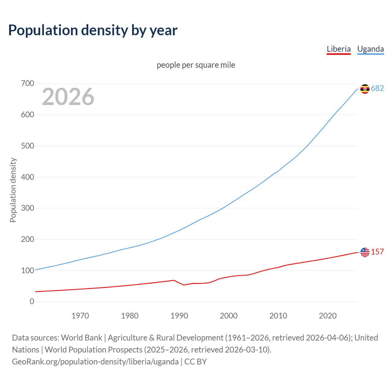 From 2006 to 2026, population density in Liberia increased by 67.6%, compared to a 82.7% growth in Uganda.