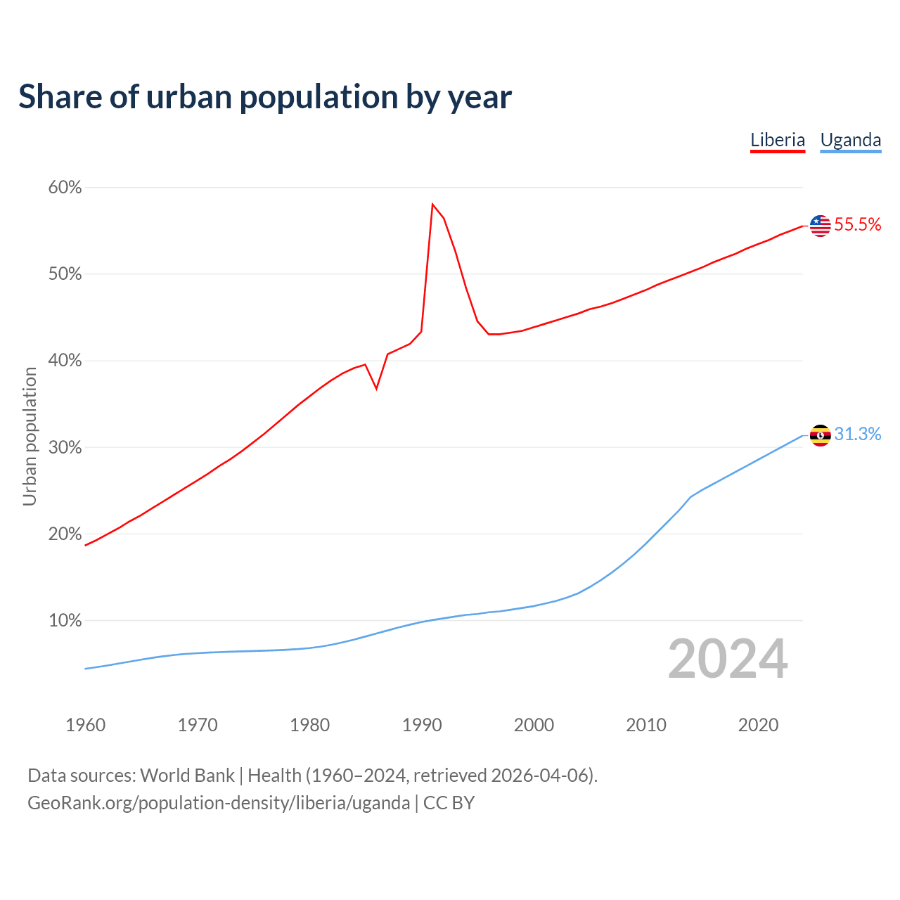 From 2004 to 2024, the share of urban population changed from 45.4% to 55.5% in Liberia and from 13.1% to 31.3% in Uganda.
