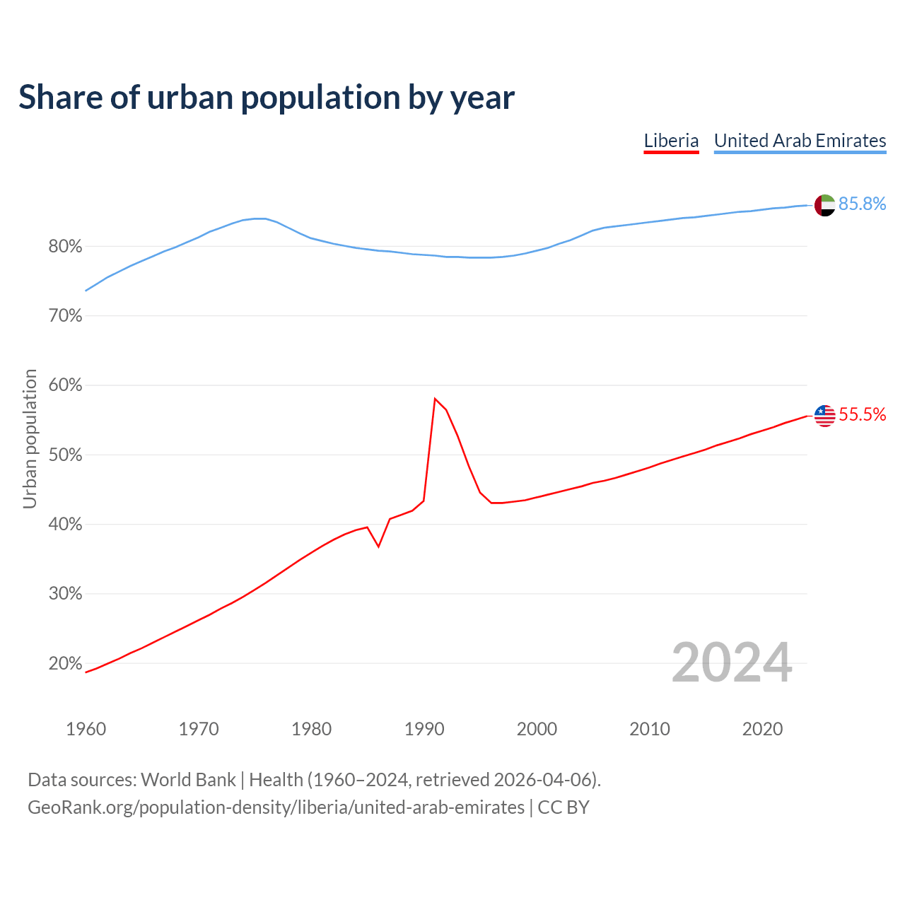From 2004 to 2024, the share of urban population changed from 45.4% to 55.5% in Liberia and from 81.5% to 85.8% in the United Arab Emirates.
