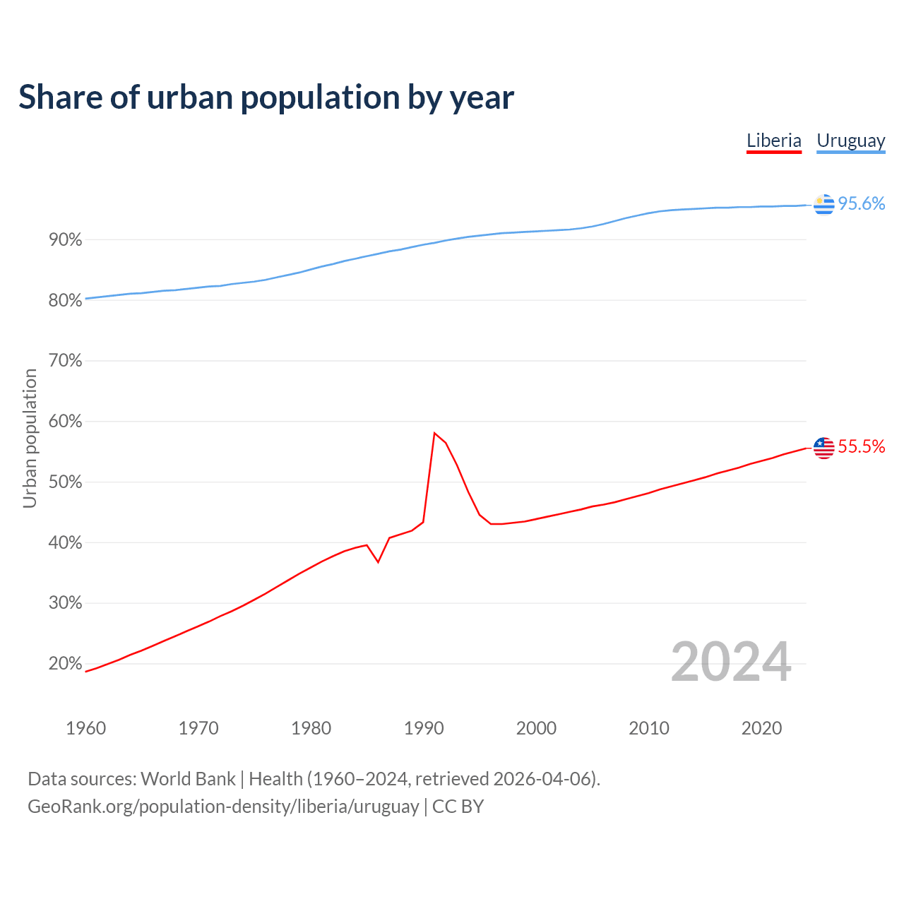 From 2004 to 2024, the share of urban population changed from 45.4% to 55.5% in Liberia and from 91.8% to 95.6% in Uruguay.