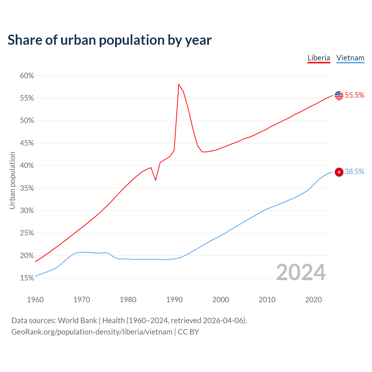 From 2004 to 2024, the share of urban population changed from 45.4% to 55.5% in Liberia and from 26.8% to 38.5% in Vietnam.