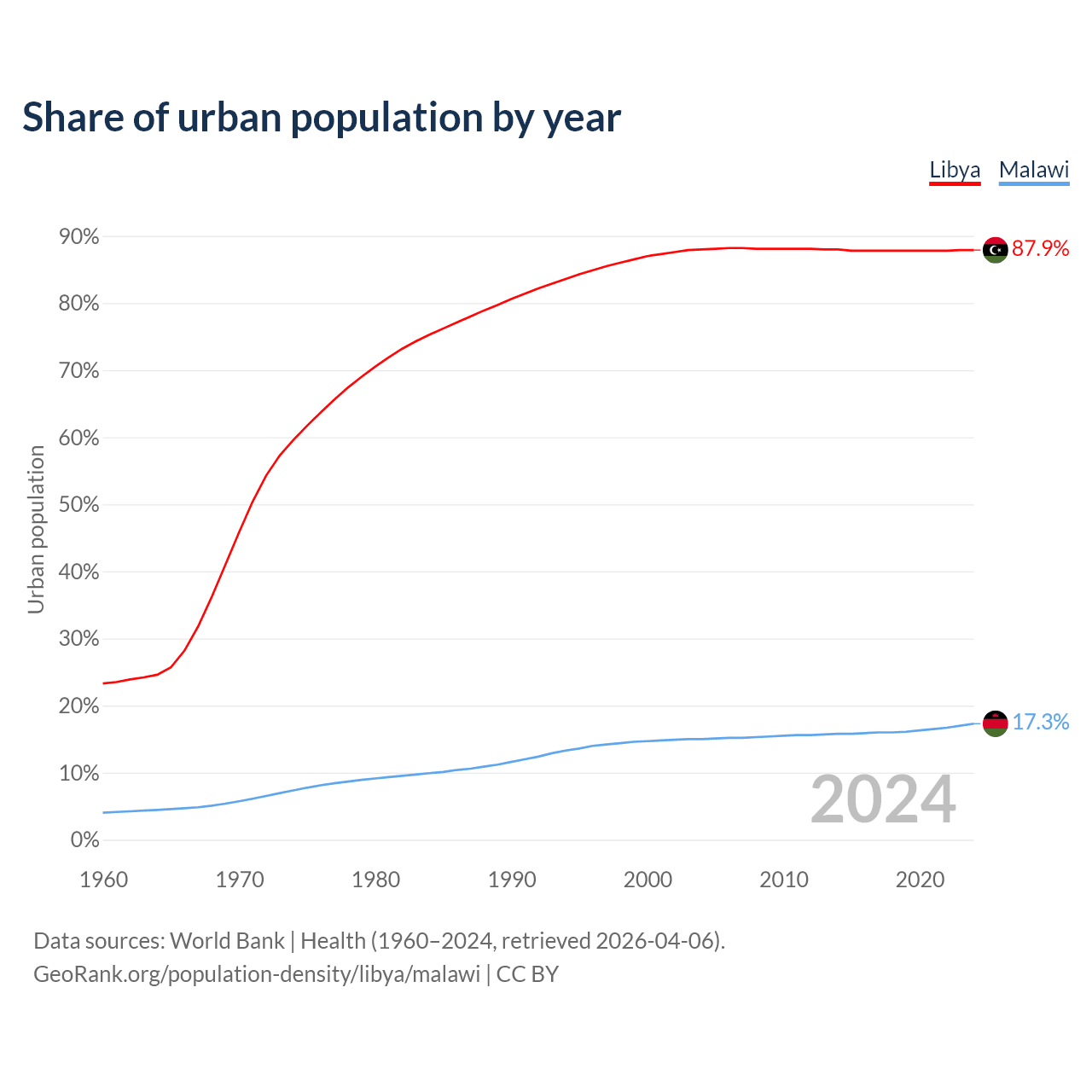 From 2004 to 2024, the share of urban population changed from 88% to 87.9% in Libya and from 15% to 17.3% in Malawi.