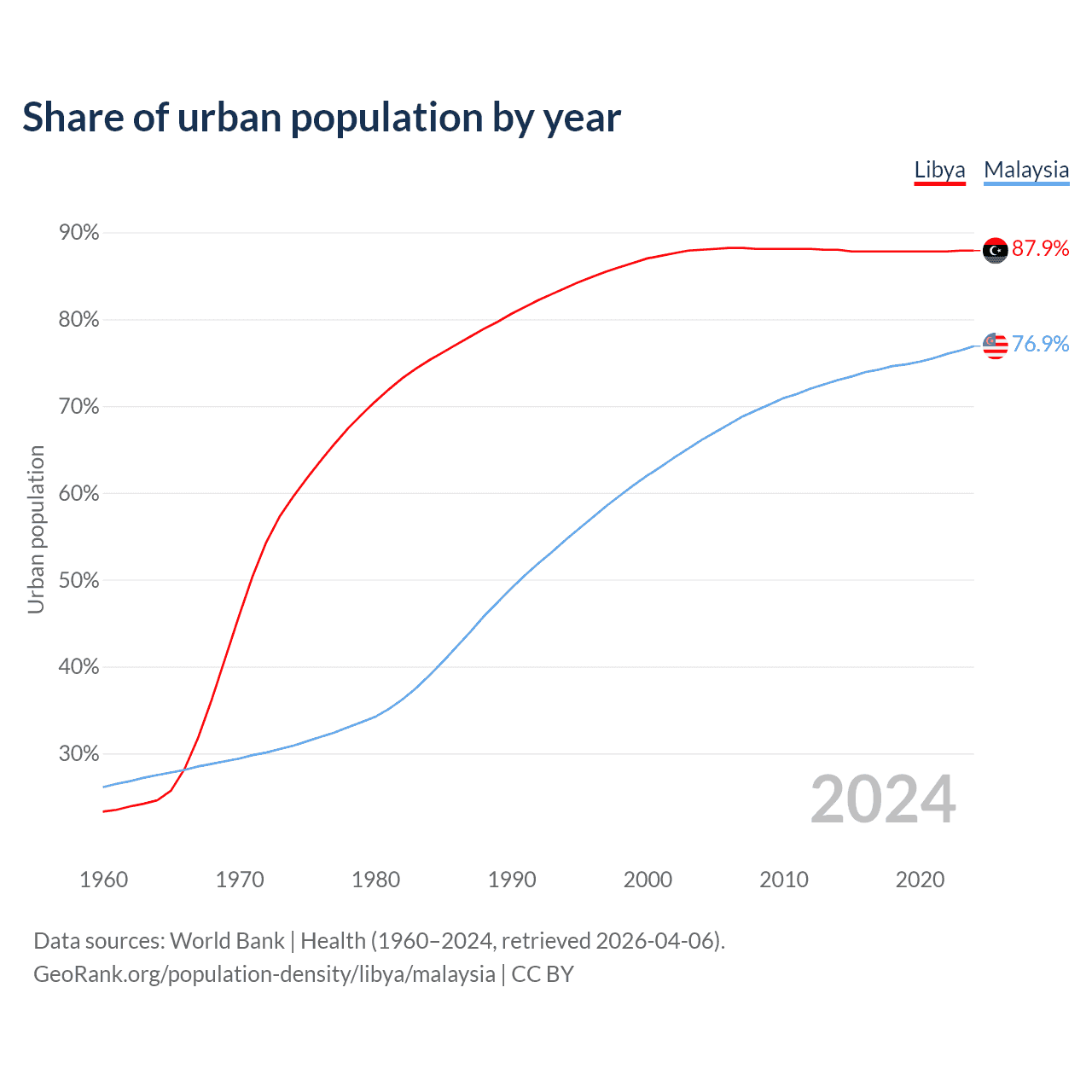 From 2004 to 2024, the share of urban population changed from 88% to 87.9% in Libya and from 66.1% to 76.9% in Malaysia.