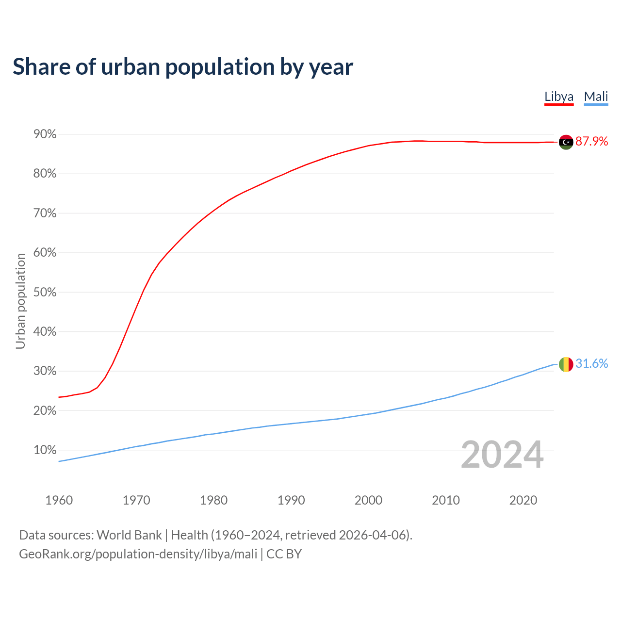 From 2004 to 2024, the share of urban population changed from 88% to 87.9% in Libya and from 20.5% to 31.6% in Mali.