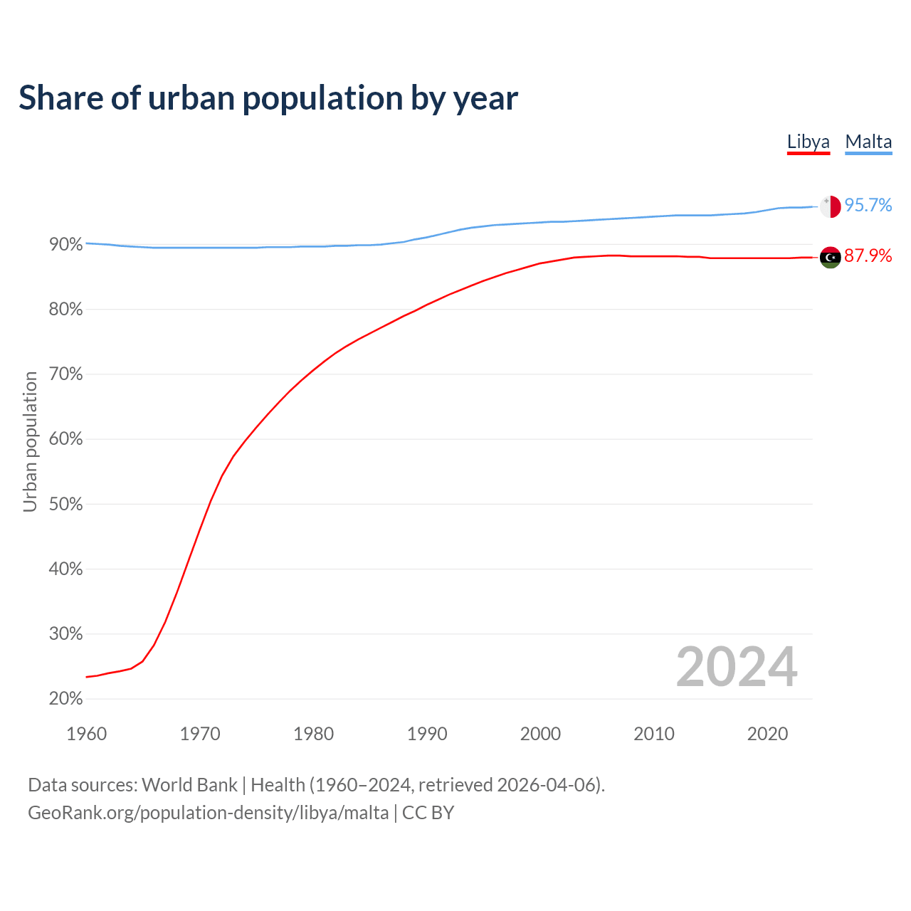 From 2004 to 2024, the share of urban population changed from 88% to 87.9% in Libya and from 93.6% to 95.7% in Malta.