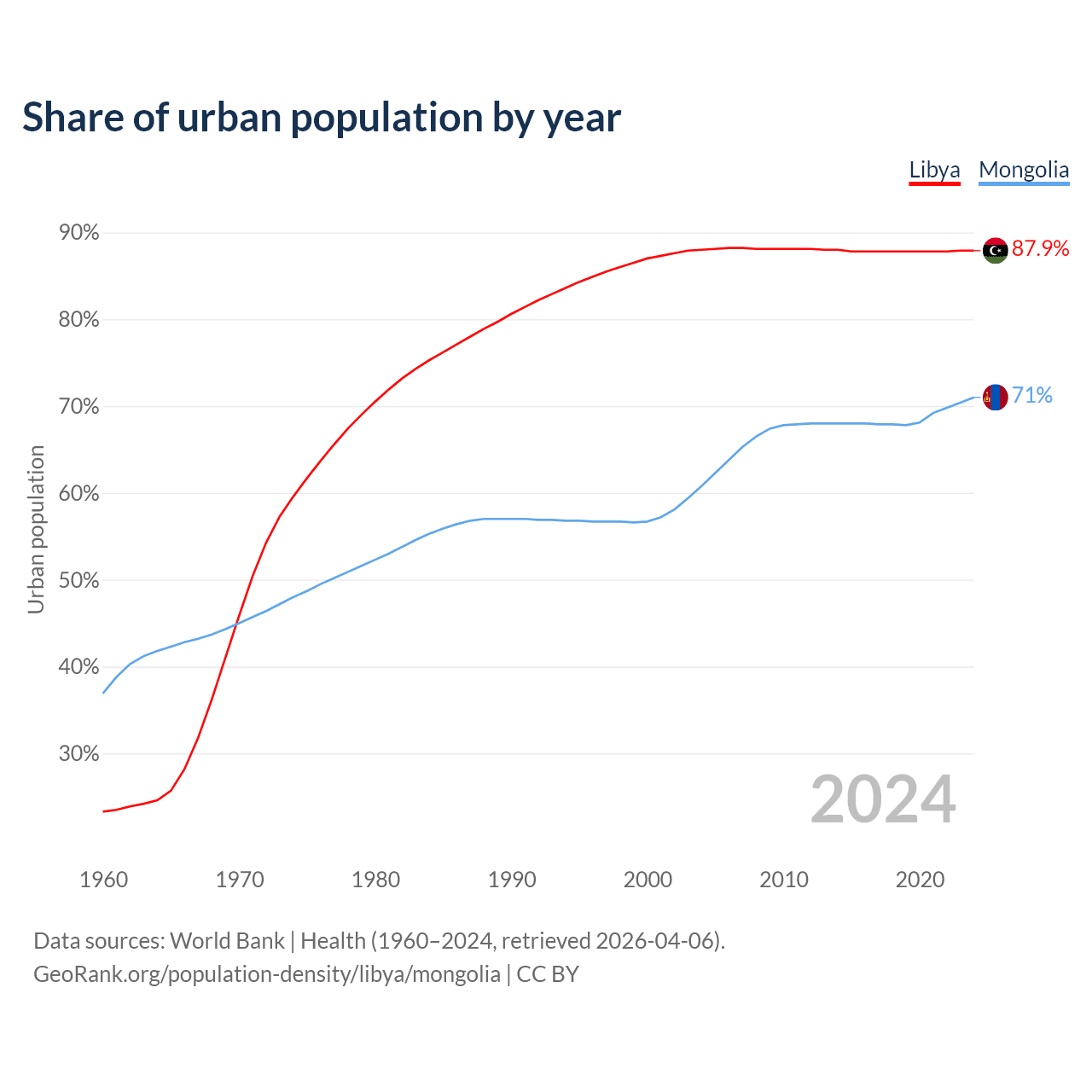 From 2004 to 2024, the share of urban population changed from 88% to 87.9% in Libya and from 60.8% to 71% in Mongolia.