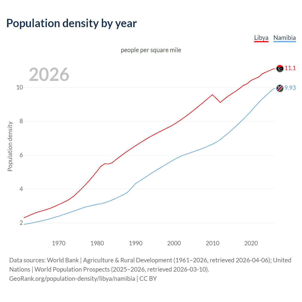 From 2006 to 2026, population density in Libya increased by 26%, compared to a 58.5% growth in Namibia.
