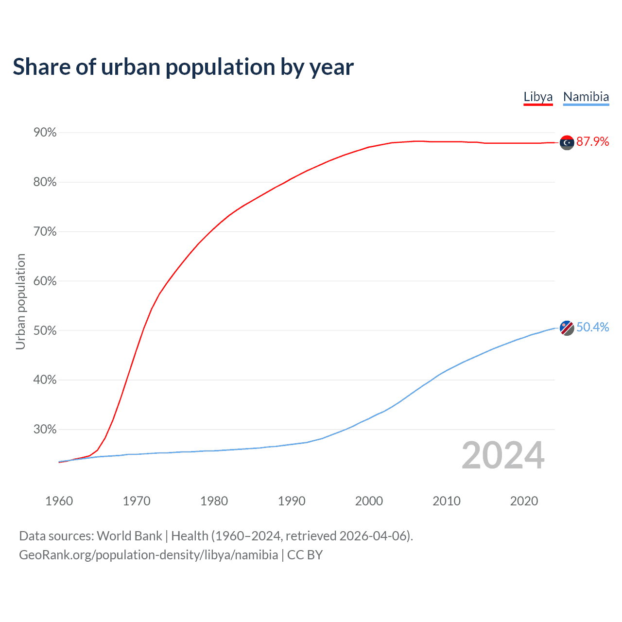 From 2004 to 2024, the share of urban population changed from 88% to 87.9% in Libya and from 35.5% to 50.4% in Namibia.
