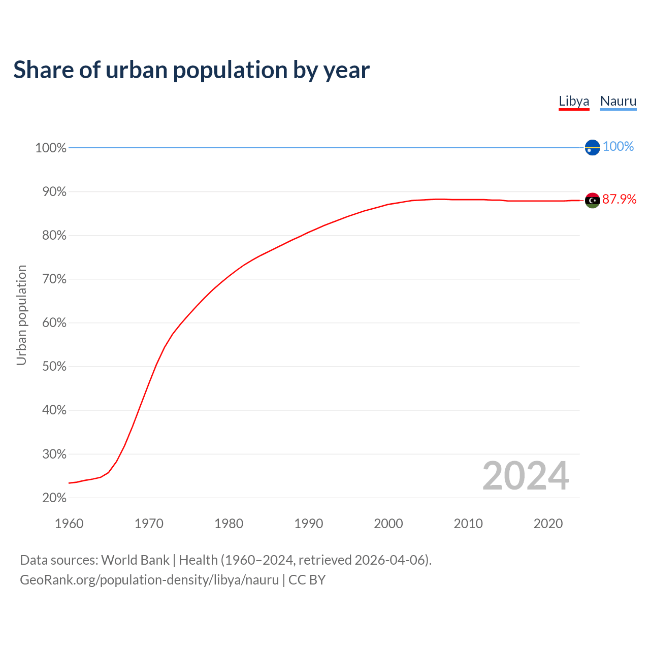 From 2004 to 2024, the share of urban population changed from 88% to 87.9% in Libya and from 100% to 100% in Nauru.