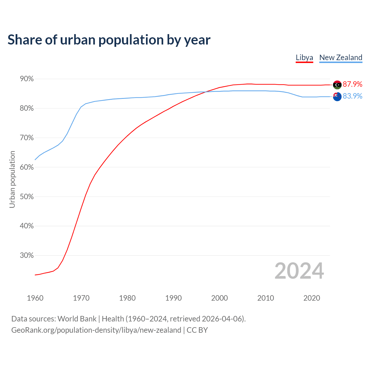 From 2004 to 2024, the share of urban population changed from 88% to 87.9% in Libya and from 85.9% to 83.9% in New Zealand.