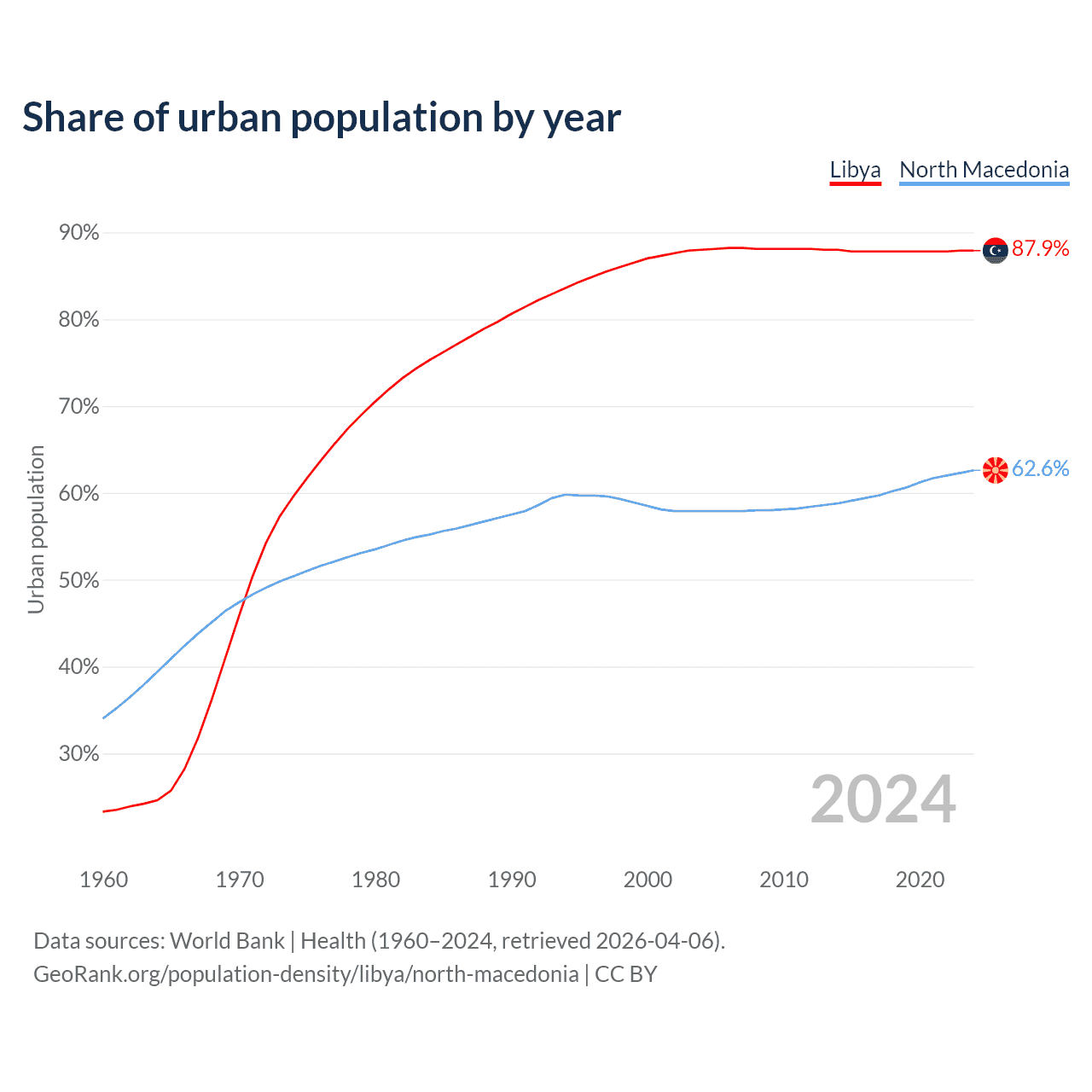 From 2004 to 2024, the share of urban population changed from 88% to 87.9% in Libya and from 57.9% to 62.6% in North Macedonia.