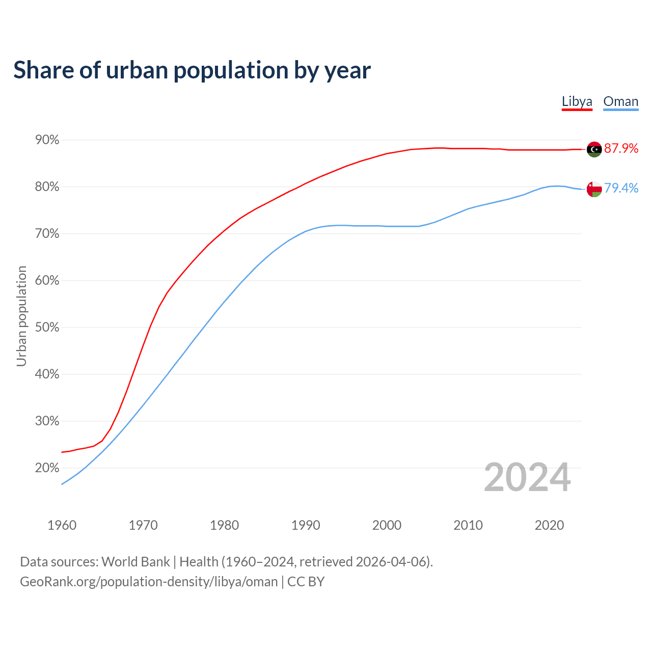 From 2004 to 2024, the share of urban population changed from 88% to 87.9% in Libya and from 71.5% to 79.4% in Oman.