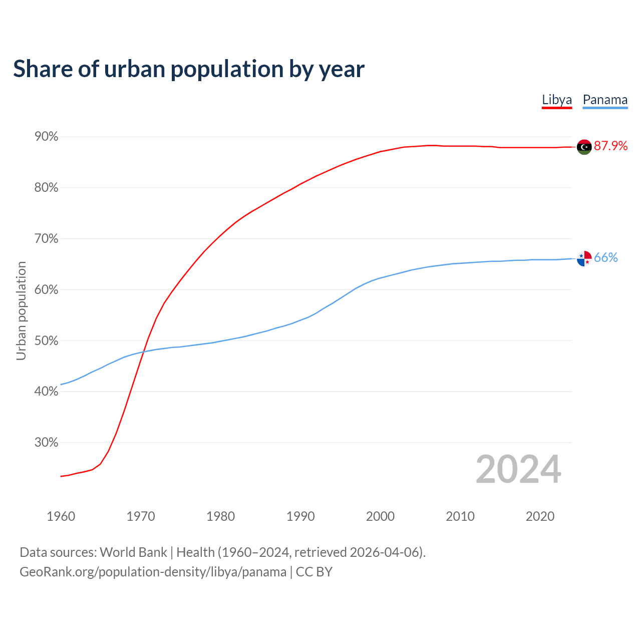From 2004 to 2024, the share of urban population changed from 88% to 87.9% in Libya and from 63.8% to 66% in Panama.