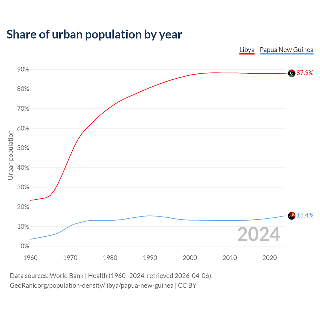 From 2004 to 2024, the share of urban population changed from 88% to 87.9% in Libya and from 13.1% to 15.4% in Papua New Guinea.
