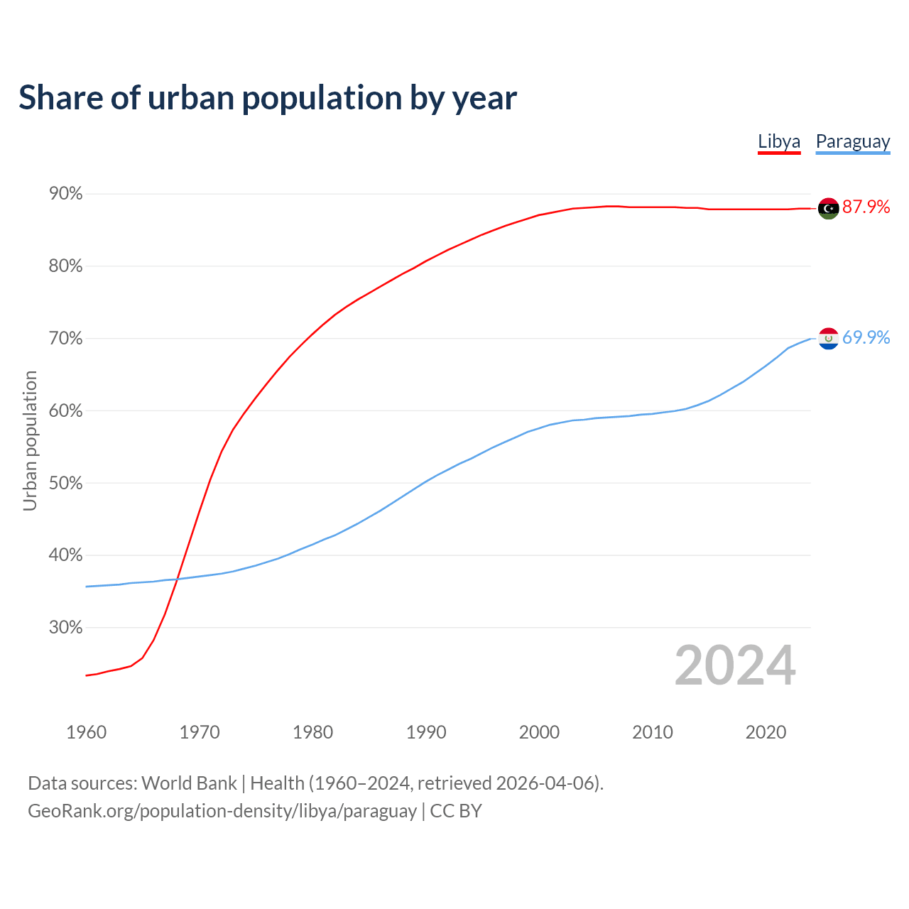 From 2004 to 2024, the share of urban population changed from 88% to 87.9% in Libya and from 58.7% to 69.9% in Paraguay.