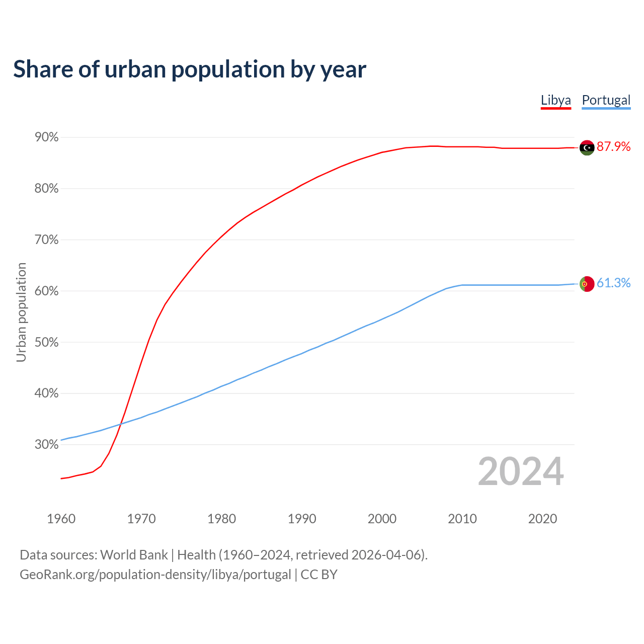 From 2004 to 2024, the share of urban population changed from 88% to 87.9% in Libya and from 57.4% to 61.3% in Portugal.